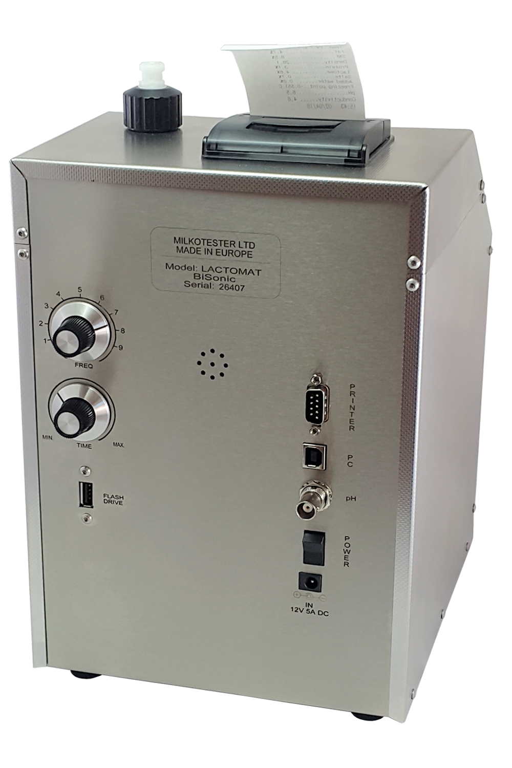 Milkotester presents the new ultrasonic milk fat testing machines Lactomat BiSonic Touch. This milk analyzer gives you double advantage at price of one. Upgraded software and ultrasonic stirrer for removal of air from the milk sample. The new main PCB powered by the ARM Cortex , offers you amazing speed with its 32-bit operation. This provides a 20-fold increase in data processing capacity when compared to the traditional milk analyzers. Protective coating of the electronics at high humidity. Solid, robust construction and stainless steel housing. Free cloud storage with unlimited access to the information not depending on the connected device or location. SMPS based power supply, separated serial ports for printer and PC. Three calibration channels are available. Standard calibrations for milk analyzer LACTOMAT BiSonic Touch are for Cow milk, Sheep milk, UHT. The analyzer can be calibrated also for: Buffalo milk, Pasteurized milk, Goat milk, Mixed milk, Skimmed milk, Whey and other types of milk and milk derivatives.