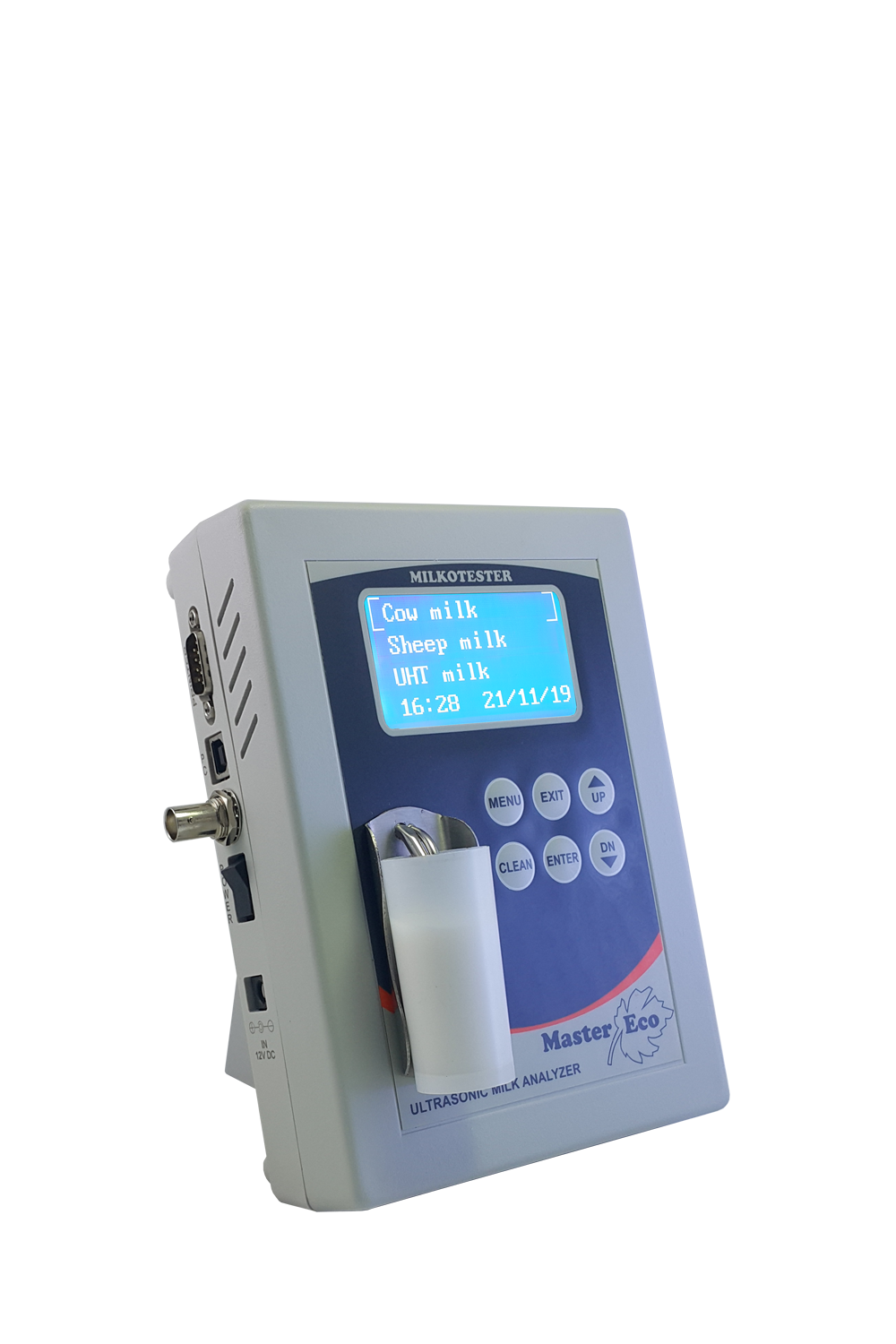 MASTER ECO is high quality milk analyzer for measurement of the main milk parameters.Correct analysis of the components is carried out for 60sec (40sec/30sec). In addition, ph option and Bluetooth can also be added to the device. The analyzer is equipped with plastic body, compact and low weight, comfortable for narrow and less accessible areas. The switching adapter ensures stable work of the device in the event of voltage fluctuations in the range of 100V to 260 V. Three calibration channels are available. Standard calibrations for milk analyzer Master ECO are for Cow milk, Sheep milk, UHT. The analyzer can be calibrated also for: Buffalo milk, Pasteurized milk, Goat milk, Mixed milk, Skimmed milk, Whey and other types of milk and milk derivatives.